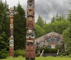 The totem poles represent the culture and traditions of the Tlingit people, the Indigenous inhabitants of Southeast Alaska.