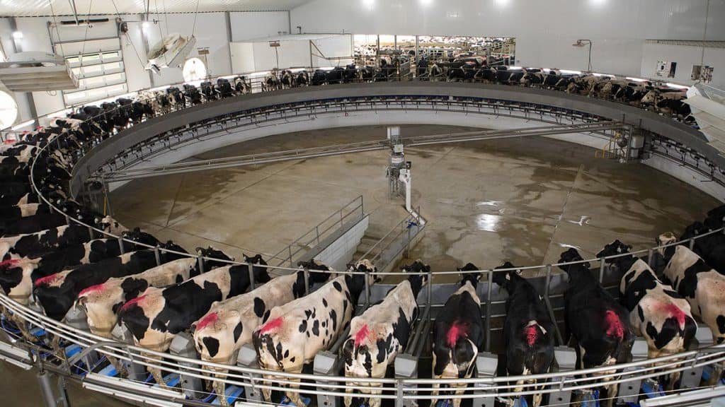 View cows being milked on an 80-stall milking carousel through large observation windows.